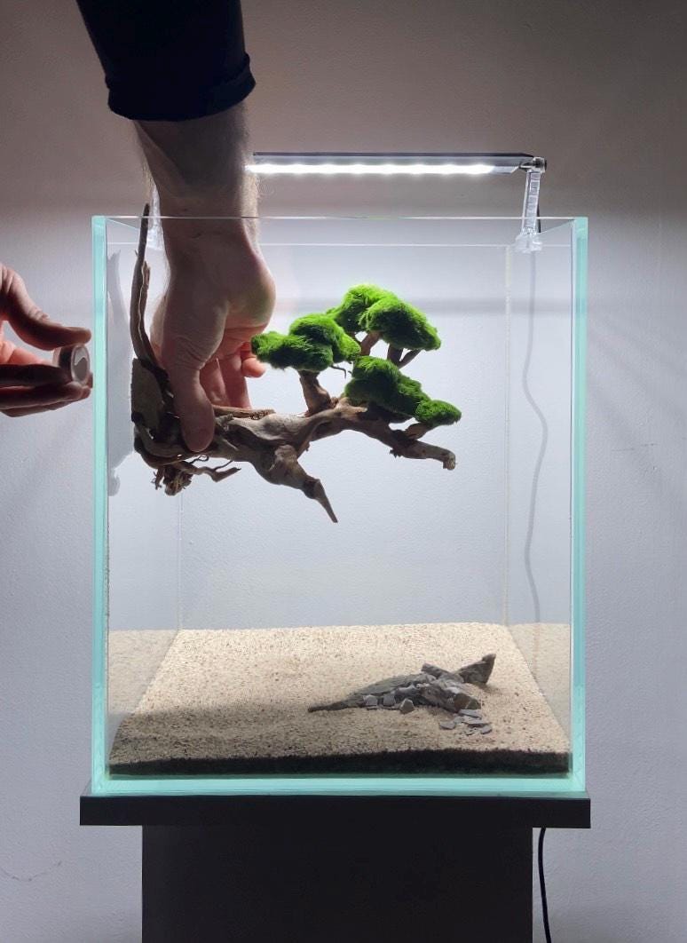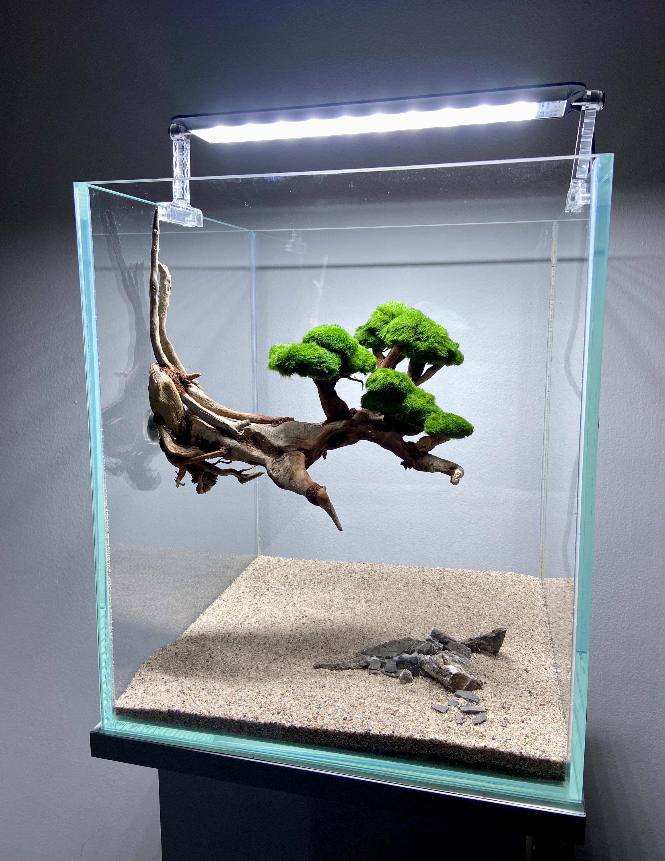 The bonsai shown in the photos is displayed in an aquarium measuring 30 × 30 × 35 cm (reference tank for presentation purposes).